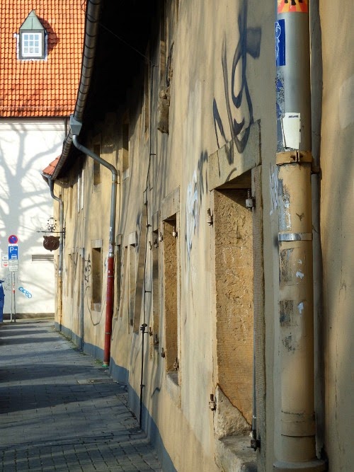 Der schmale Gehweg verläuft entlang buckliger Hauswände mit hier und da bröckelndem Putz.